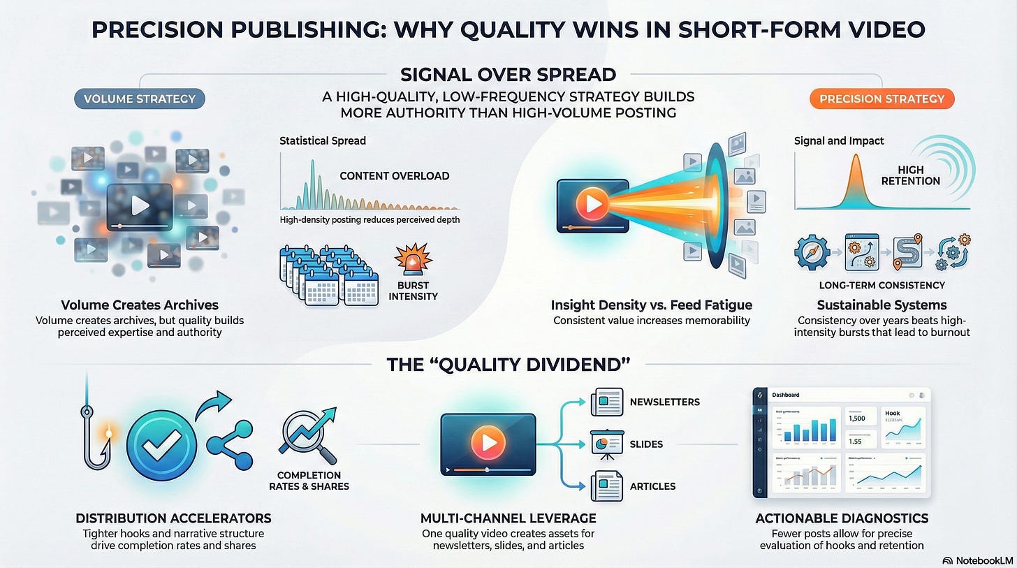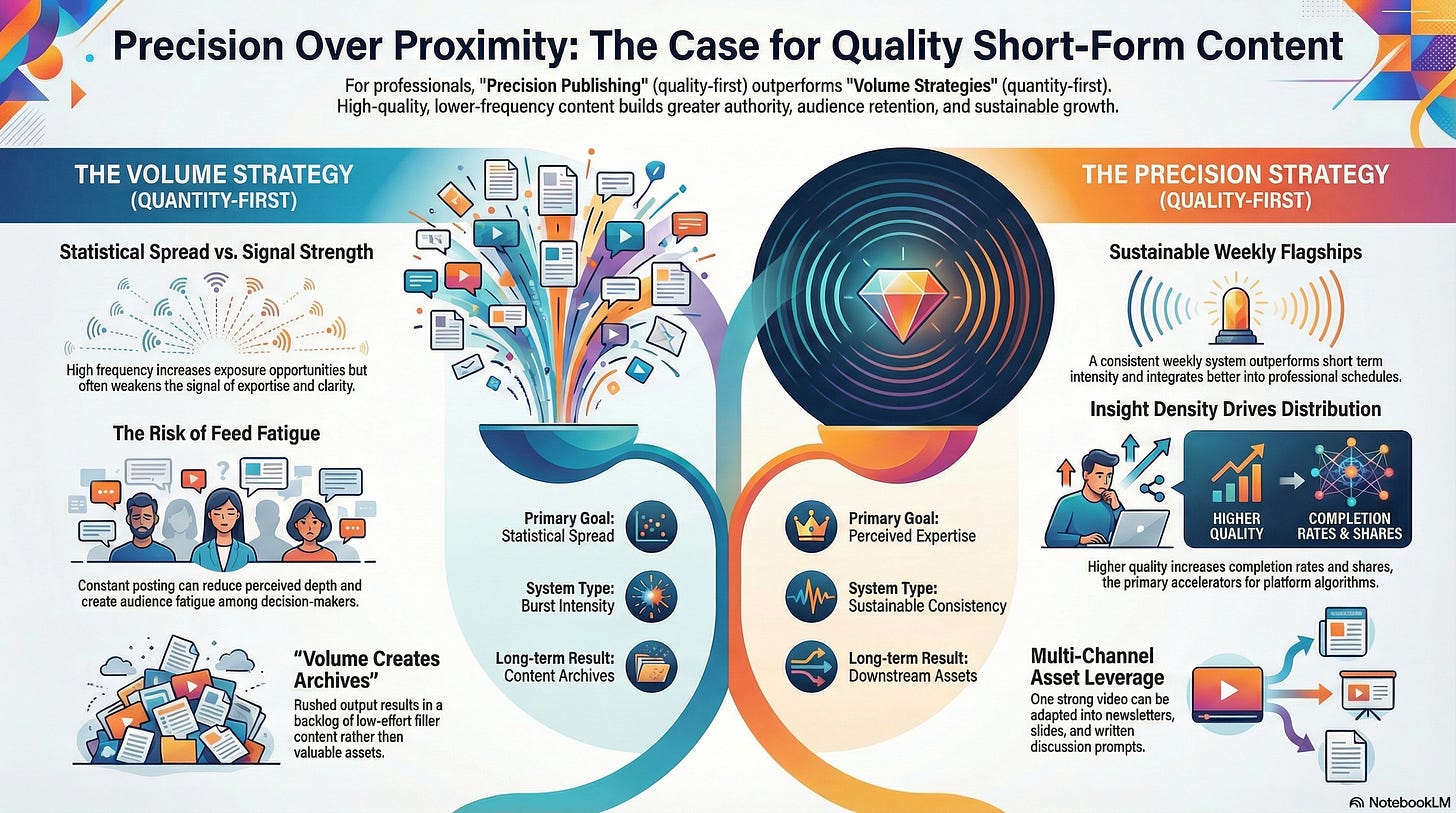 Volume-based strategies are built on the logic of “statistical spread,” operating on the gamble that more posts simply create more opportunities for exposure. But in professional branding, your signal-to-noise ratio is your most valuable currency. Each piece of content you publish serves as a public proxy for your perceived expertise, clarity of thinking, and message discipline.When output is rushed to satisfy a daily quota, those signals inevitably weaken. Rushed execution leads to a loss of the precision required to establish a dominant professional presence. By slowing down, you allow for the research and framing necessary to sharpen your message.”Frequency increases chances — quality increases impact.”